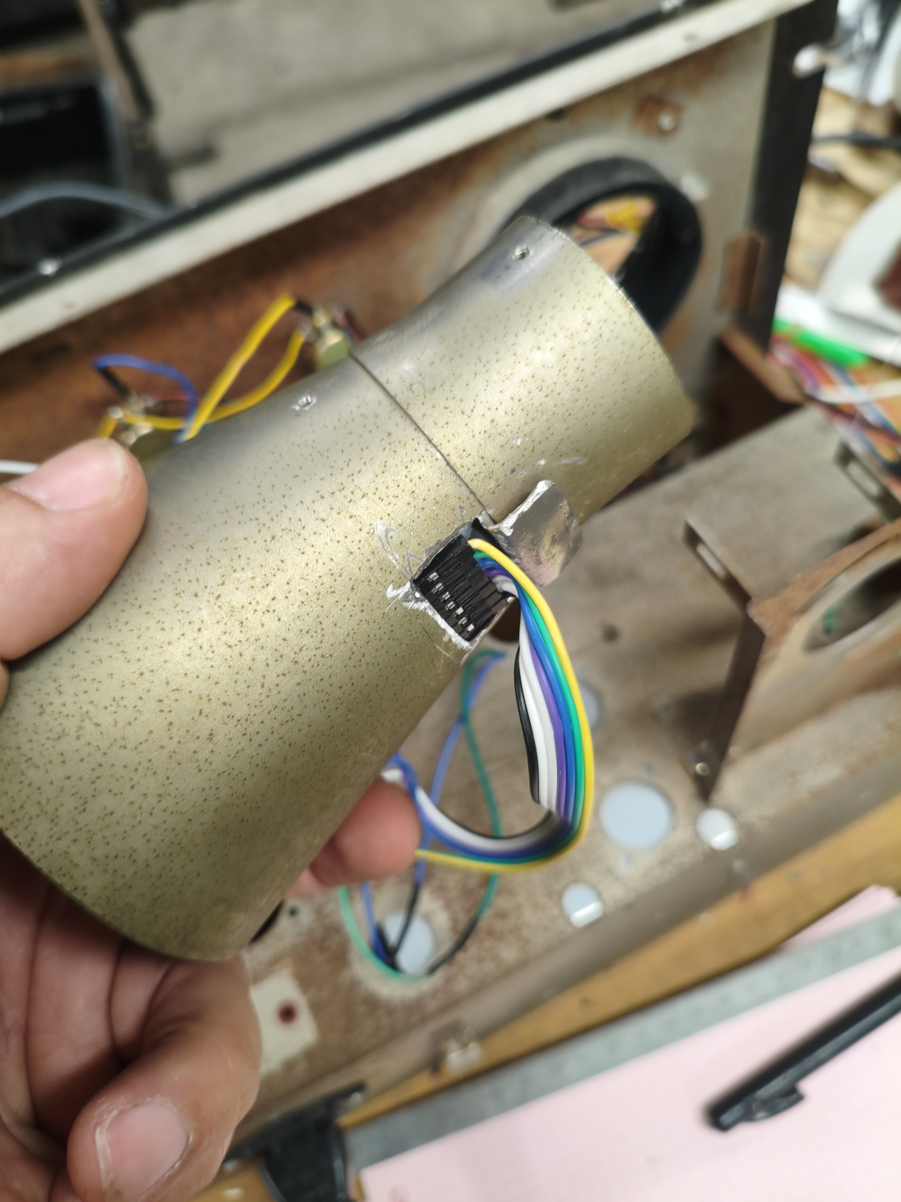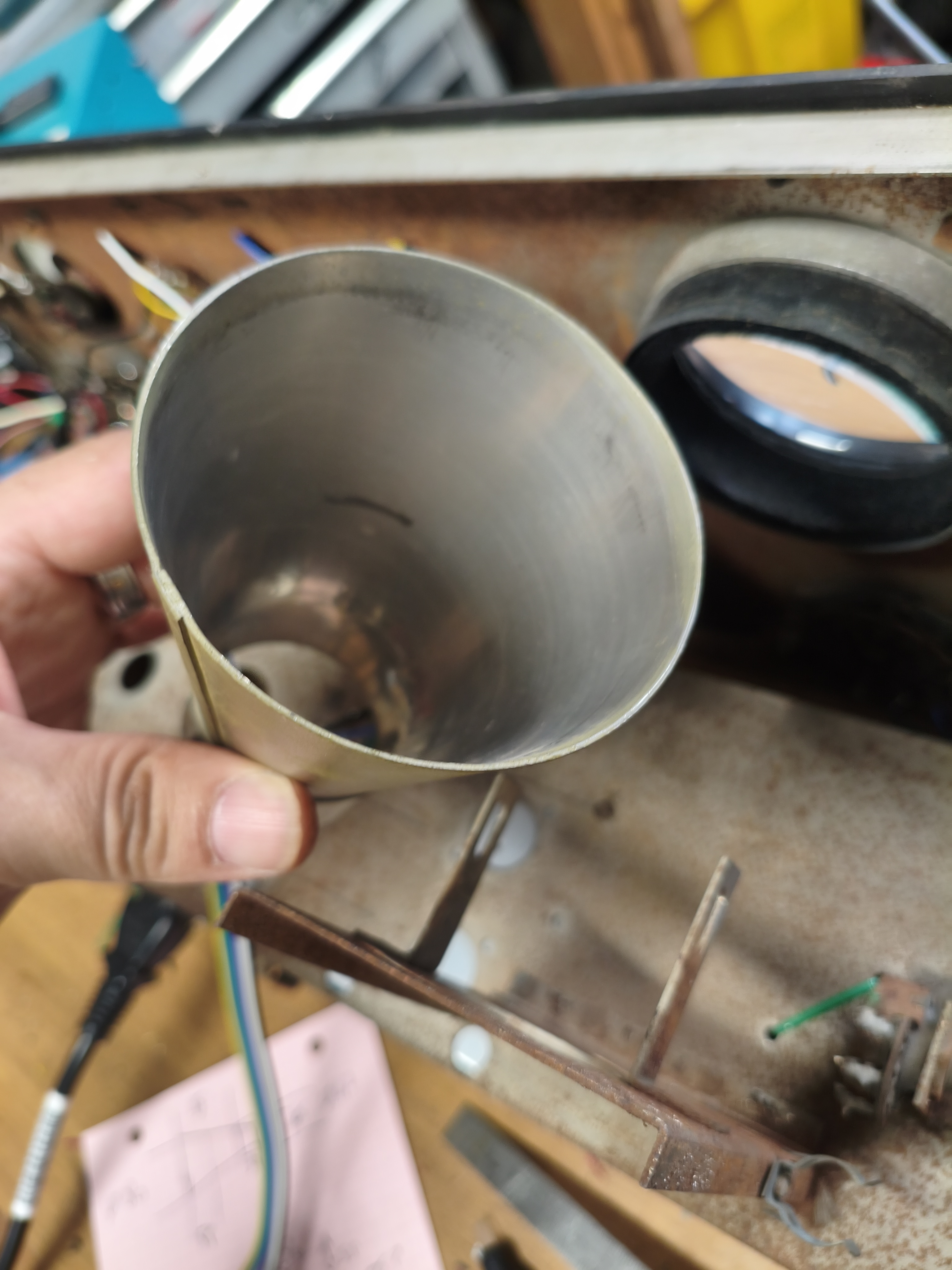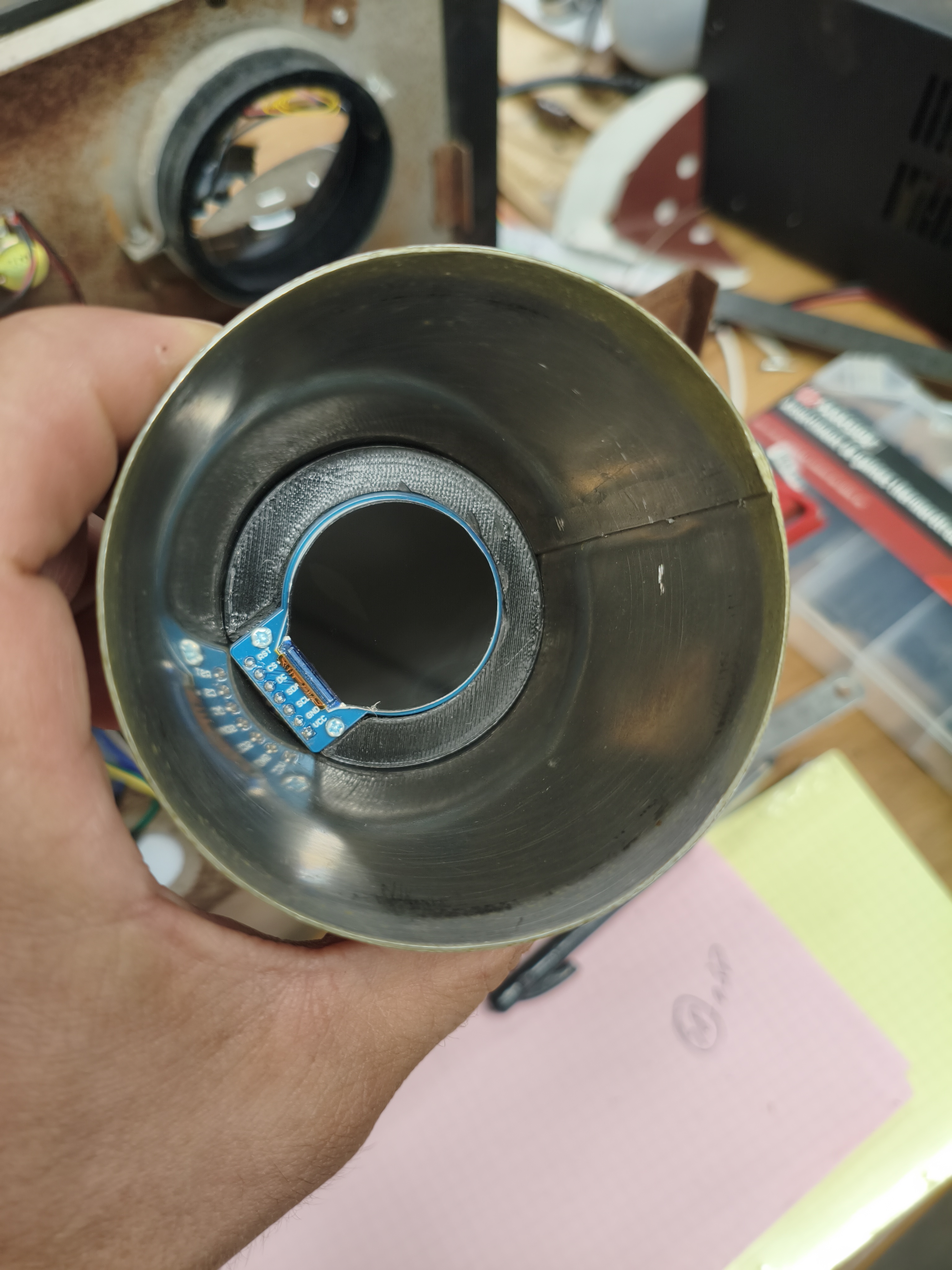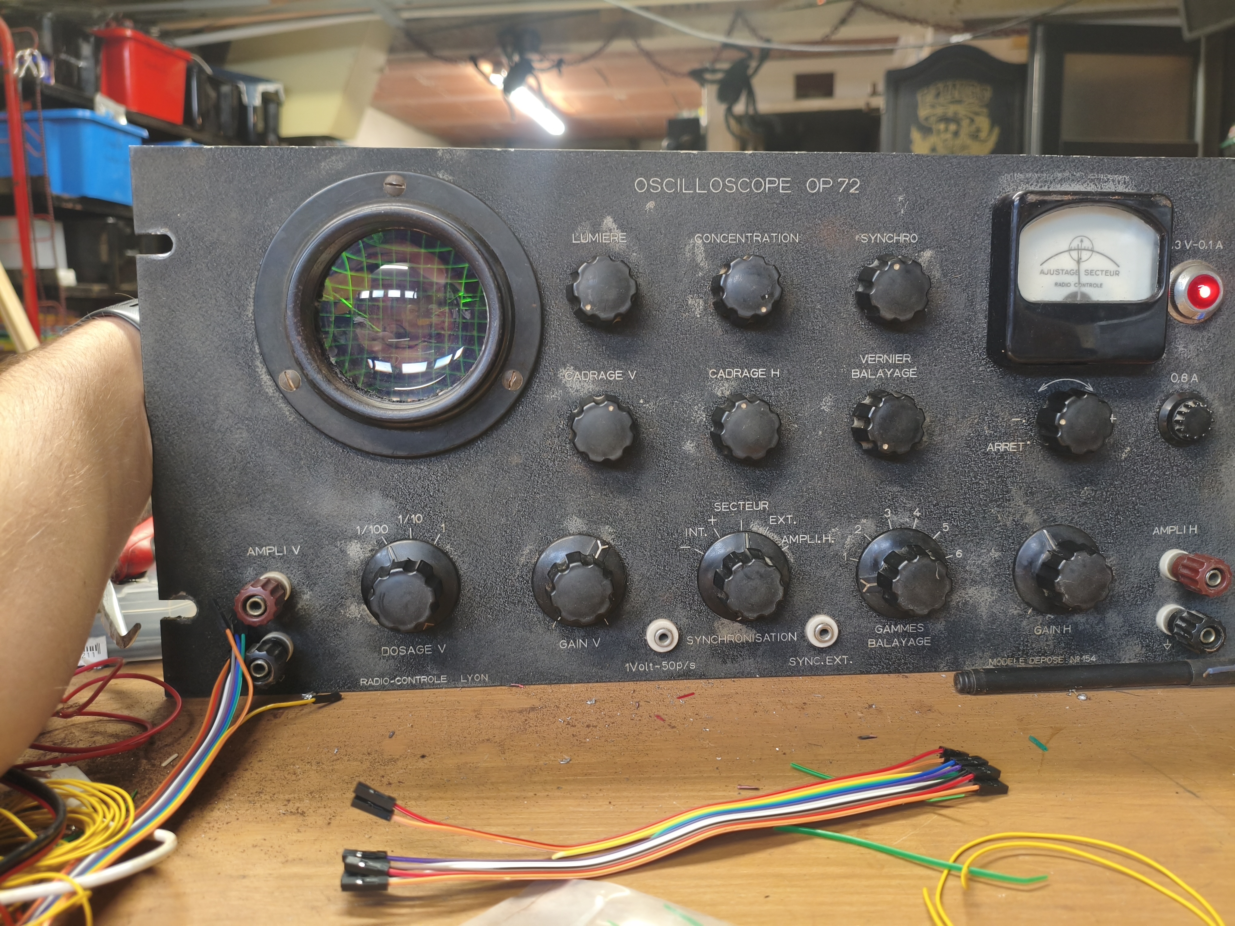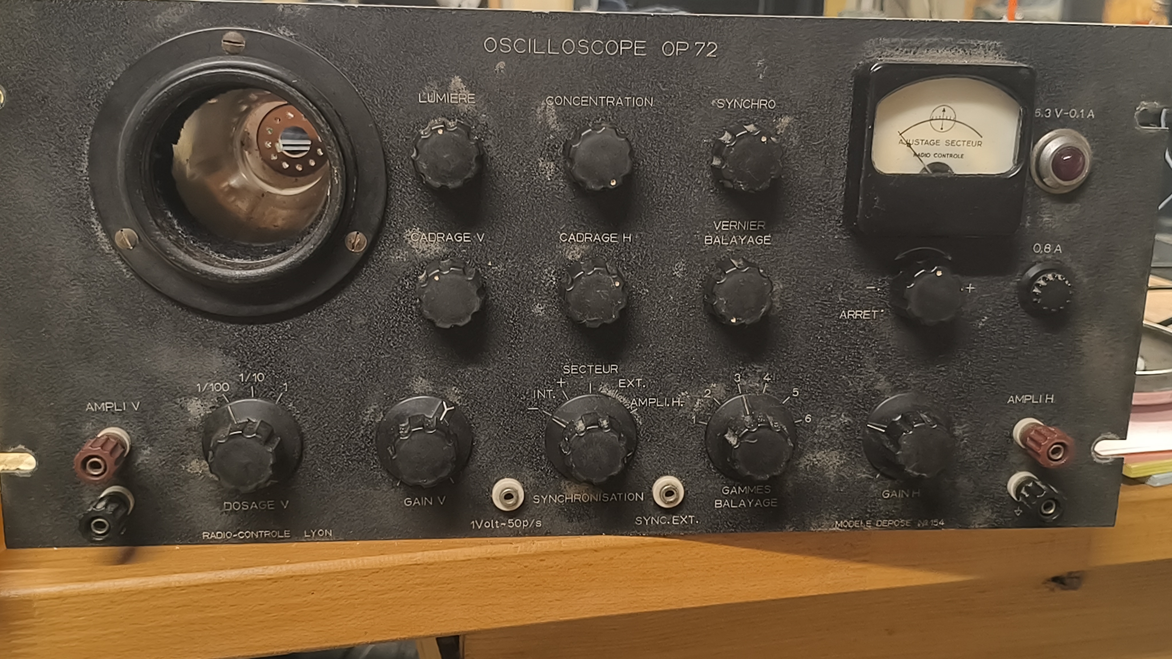 Fin juillet, lors d'enchères en ligne, j’ai mis la main sur plusieurs armoires de contrôle de télévision cathodique et radio parmi lesquelles se trouvait un oscilloscope des années 50–60. Ses condensateurs, câbles et autres composants sont désormais hors d’usage, et la lampe est grillée —> le brancher serait trop risqué. =>02/08/2025 J’ai donc décidé de lui donner une seconde vie, en modernisant ses entrailles tout en préservant son look vintage. Le projet est donc de remplacer la lampe par un écran OLED piloté par un ESP32. Les six curseurs à droite de l'écran devront faire évoluer la courbe de l'oscilloscope animé indirectement par un capteur audio. La premièere étape est de vider tout les composants inutiles : transformateur HT, lampes, condensateurs, fils, résistances. Tout ça afin de l'aléger et de laisser la place pour le nouveau montage. =>23/08/2025 Après analyse et reflexion j'ai listé les composants nécessaires. ✅ Pour ce projet nous aurons besoin : ▷ ESP32-VROOM-32D (le cerveau du montage) ▷ Écran TFT rond 1,28″ GC9A01 (240×240 SPI) (~3,25 cm) ▷ Filtre vert pour harmoniser l’affichage ▷ Lentille grossissante K9 70 mm (focus 100) pour atteindre le diamètre original ▷ Support 3D imprimé pour fixer écran et lentille ▷ Alimentation 5 V régulée ▷ 5 potentiomètres 10 kΩ (compatibles ESP32), plus un 6ⁿᵉ spécifique pour un réglage vintage ▷ 2 interrupteurs pour des commandes spéciales ▷ Câblage coloré pour une installation propre ▷ Programme Arduino (ESP32) générant la courbe