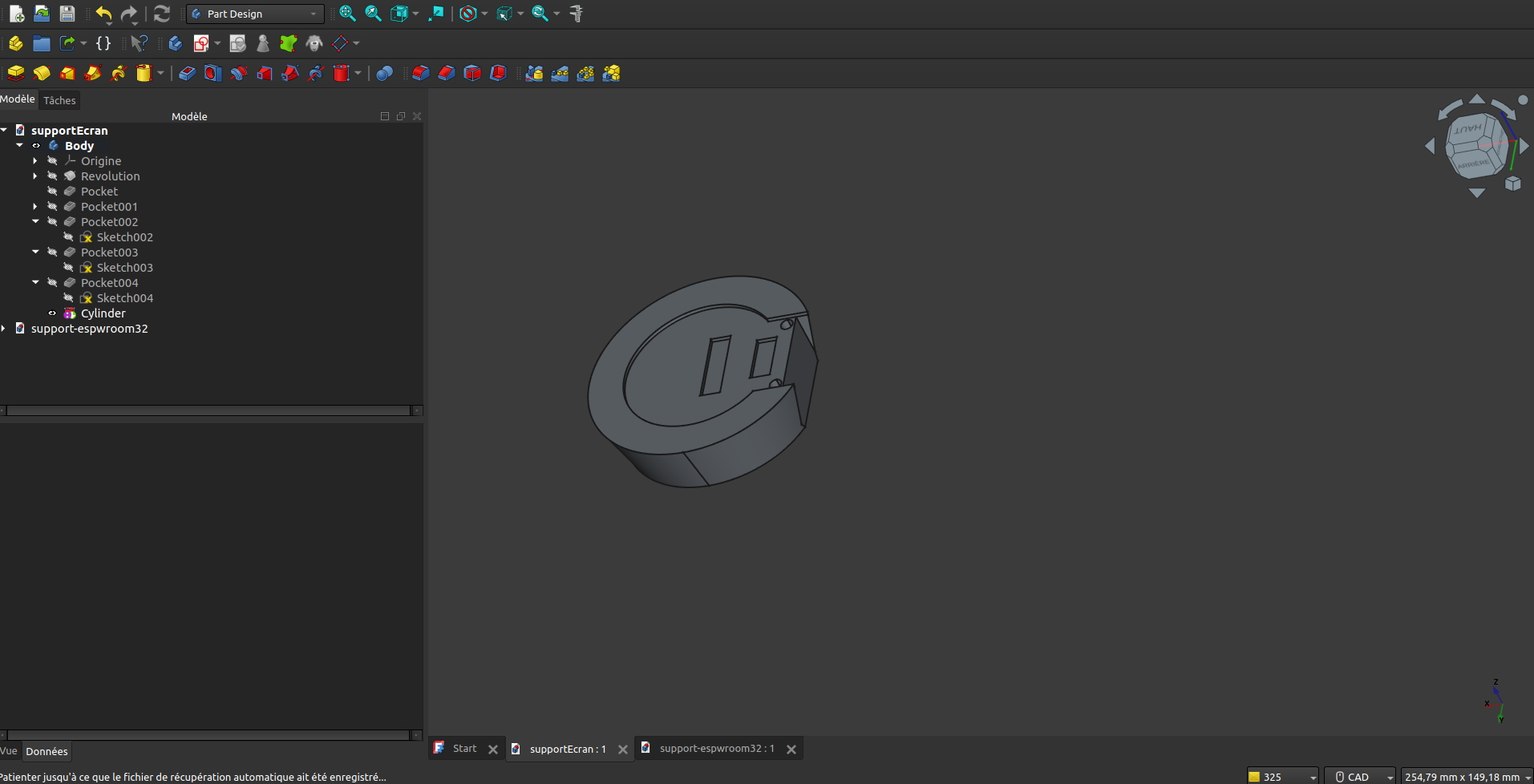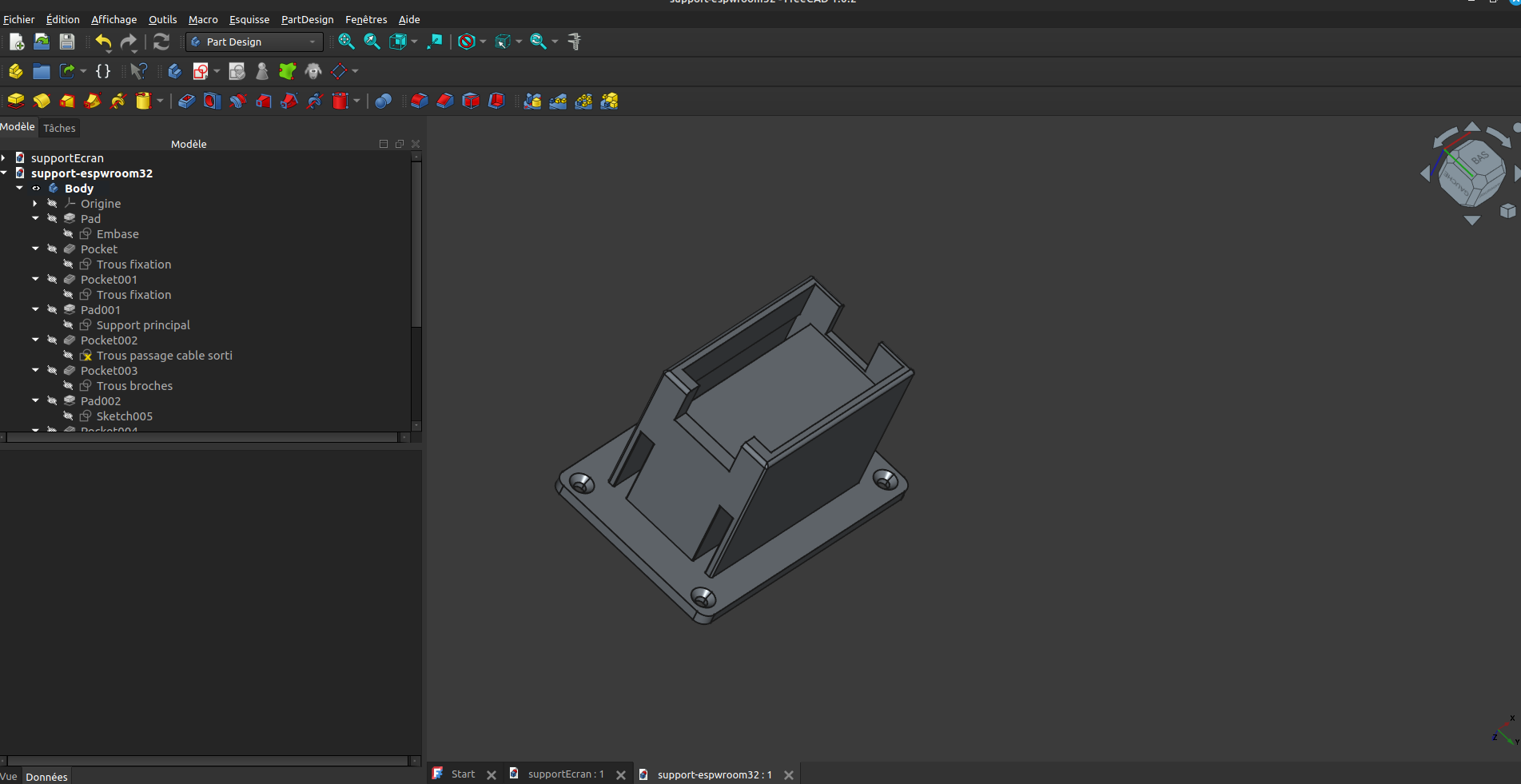 =>01/09/2025 J'ai reçu l'ESP et l'écran, passons aux supports 3D ! ✅ Les logiciels et le matériel que j'utilise pour ce chapitre : ▷ Modélisation => "FreeCAD" sous linux (gratuit et complet, mais mise en main difficile) ▷ Préparation et configuration d'impression => "PruscaSlicer" toujours sous linux (gratuit, simple et très complet) ▷ Impression => Imprimante "Neptune 3 Plus" pas très cher et efficace pour ce que j'ai à faire, le plateau d'impression est plutôt généreux (Volume d'impression 320 x 320 x 400 mm³) Le but de ce chapitre est de créer via une imprimante 3D un support pour l'ESP32 et un autre pour l'écran OLED. J'avais trouvé un fichier STL sur internet mais malheureusement, après impression il ne convient pas. Donc on part sur un modélisation 3D sur mesure ! Commençons par le support de l'ESP WROOM 32D. Je vais essayer de faire un coffrage pour accueil lez l'ESP sur un support avec 4 trous pour fixation. De plus je vais faire en sorte de faire les passage de câbles pour les GPIO qui se trouvent à l'arrière de l'ESP. ✅ Ci-dessous vous verrez l'avancement : ▷ Conception sur outil de modélisation => FreeCAD ▷ Préparation et configuration d’impression => PuriscaSlicer ▷ Et enfin le lien du fichier STL à télécharger