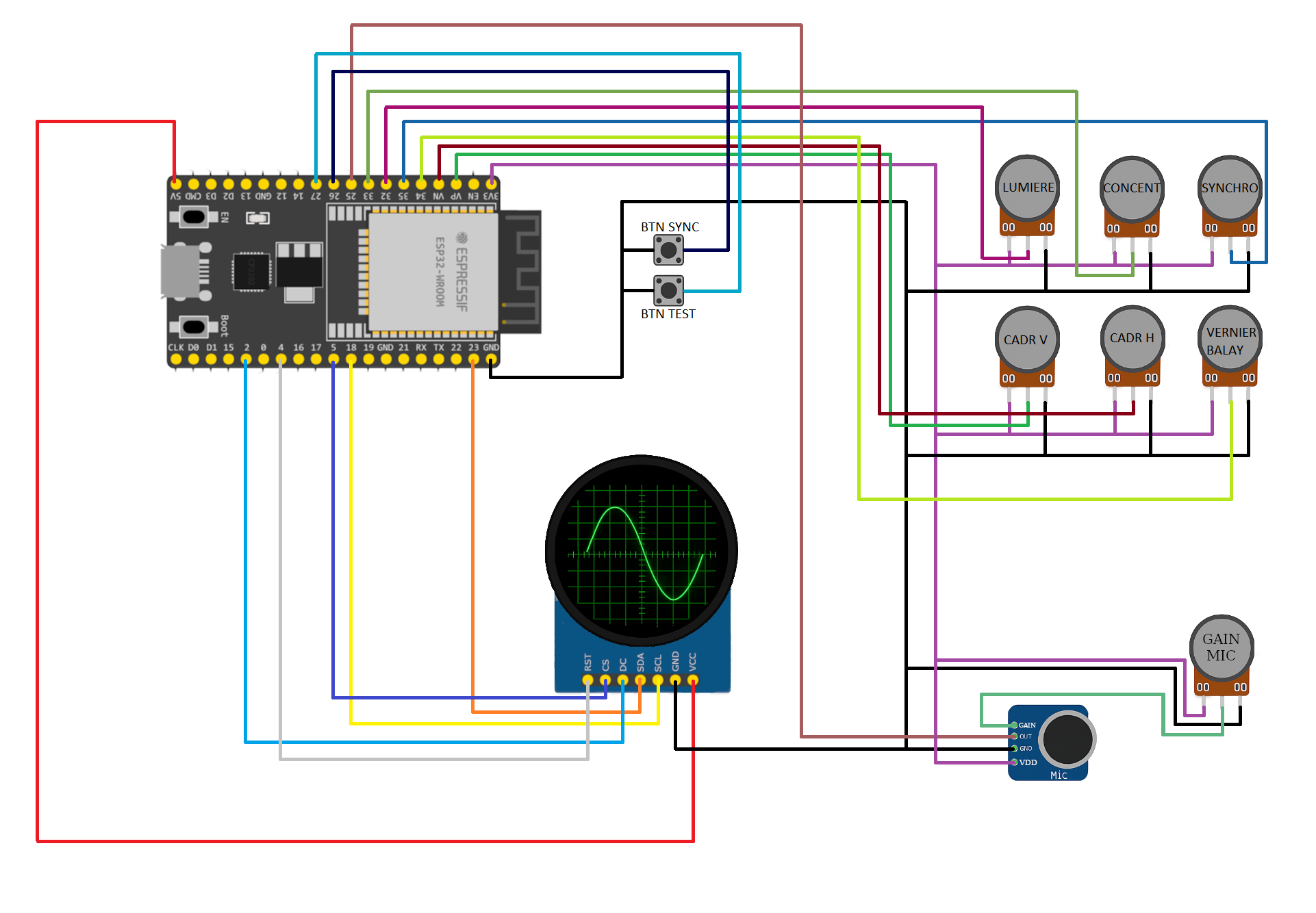 // --- Attribution des broches --- // Écran GC9A01 : // VCC - Alimentation → 5V (VCC) // GND - Mise à la masse → NEGATIF (GND) - broche GND // SCL - Horloge SPI → GPIO18 (SCK) - broche 18 // SDA - Données SPI → GPIO23 (MOSI) - broche 23 // DC - Data/Command → GPIO2 (A2_2) - broche 2 // CS - Chip select → GPIO5 (SS) - broche 5 // RES - Reset écran → GPIO4 (A2_0) - broche 4 // Potentiomètres (3 broches) : // Lumière - Intensité → GPIO32 (A1_4) - broche 32 // Concentration - Filtre flou → GPIO33 (A1_5) - broche 33 // Cadrage H (X) - Dépl. horizon → GPIO39 (A1_3) - broche VN // Cadrage V (Y) - Dépl vertical → GPIO36 (A1_0) - broche VP - 10kΩA vintage // Vernier Balayage - Vitesse phase → GPIO34 (A1_6) - broche 34 // Synchro - Intensité grille → GPIO35 (A1_7) - broche 35 //Boutons pull-up : //SYNC - Animation courbe → GPIO26 (A2_9) - broche 26 //TEST - Mode TEST → GPIO27 (A2_7) - broche 27 // Capteur audio (analogique) : // Audio - Entrée micro → GPIO25 (A2_8) - broche 25